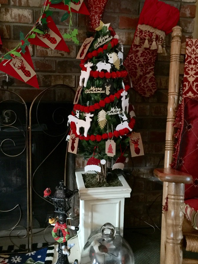 This set of small trees stays out all year (as does our Christmas tree, which is remeniscent of Italian cypress) and are again decorated with reindeer, some in the form of cleverly designed gift tags.