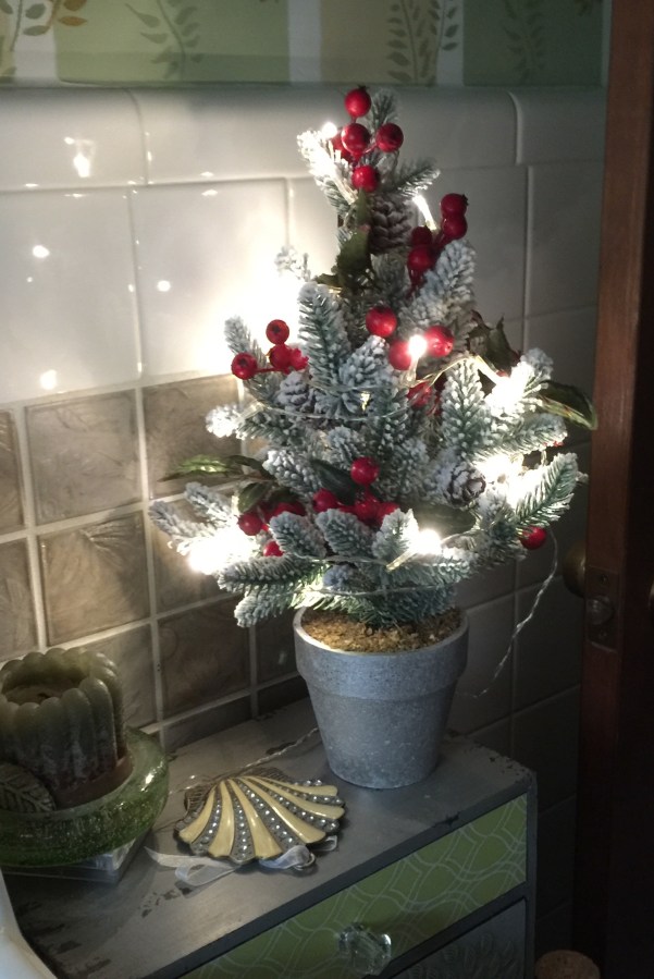 I love the recent development of tiny, battery-powered lights. Case in point: this snowy tree which can stay lit even with the lights out.