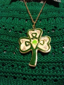I found a great, ceramic Irish shamrock ORNAMENT in Orlando. Returning home, I bought an inexpensive gold necklace and a package of jump rings and lobster claw clasps. I attached these to the ornament and now have an unique St, Patrick’s Day pendant! May you have the luck of the Irish all year round!