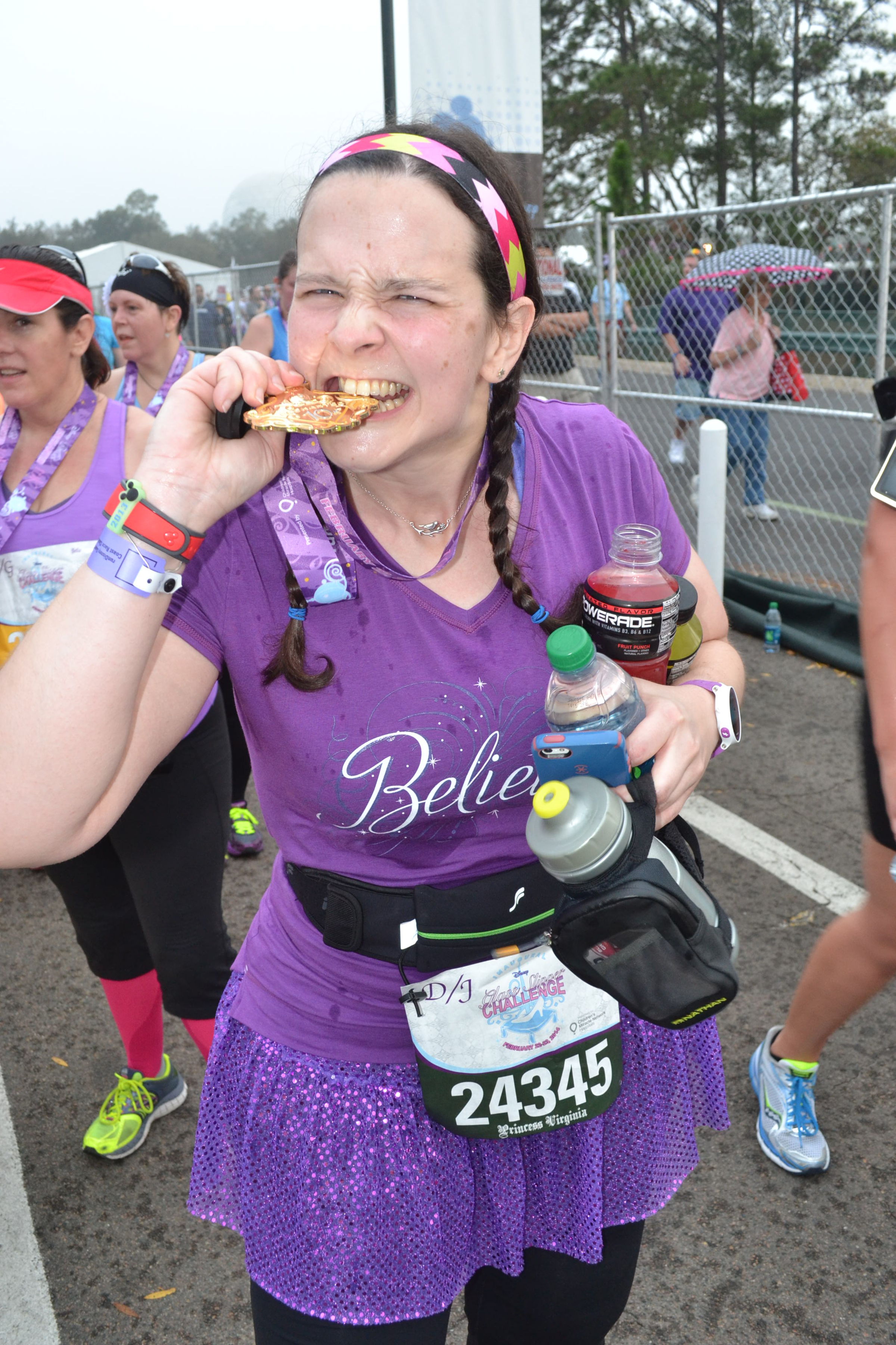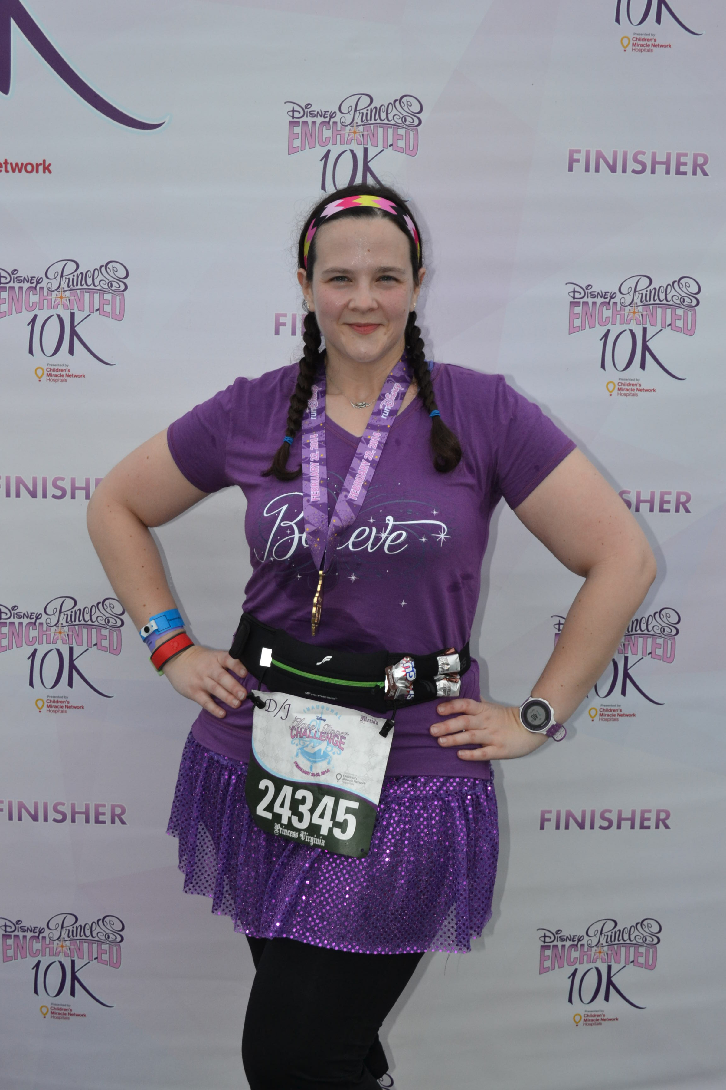 To add some excitement to obtaining my Disney Coast2Coast medal, thought I’d throw in a 10K as well. You know, didn’t want things to be too easy. First up on that fateful Saturday morning, the inagural Enchanted 10K. Wore my Believe shirt from Raw Threads, my purple Sparkle skirt and finished in a decent time for my record.